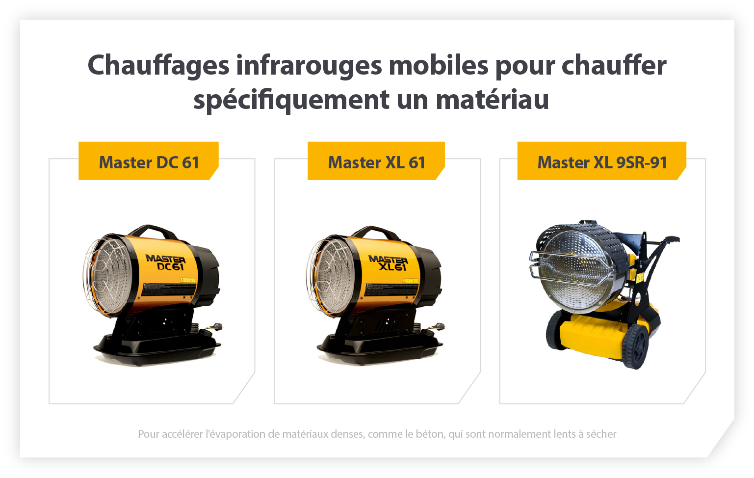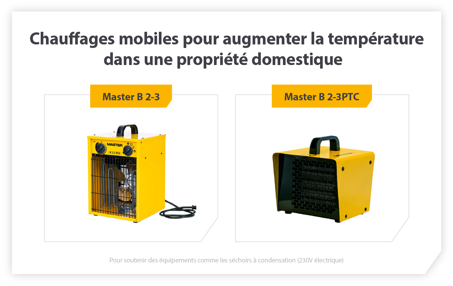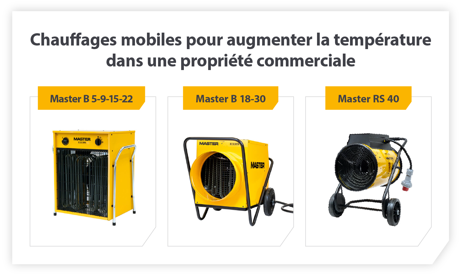 Tout dépend de la taille de la zone endommagée, du type de propriété, du niveau d'alimentation électrique, etc. Nous sommes spécialisés dans ces calculs et ces décisions, et notre large gamme de chauffages mobiles Master peut y répondre.
