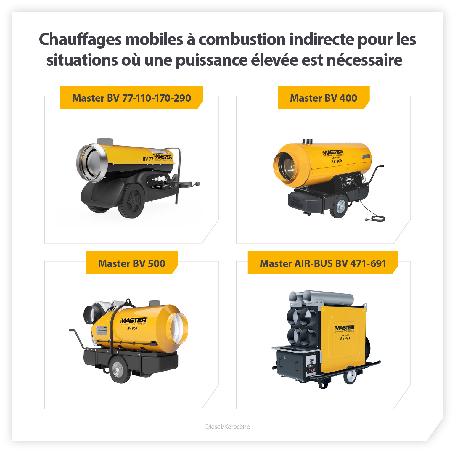 Les appareils de chauffage de la marque Master ont une puissance allant de 21 kW, similaire à celle d'une chaudière domestique au gaz, à 225 kW, ce qui est suffisant pour chauffer une grande zone commerciale ou industrielle.
