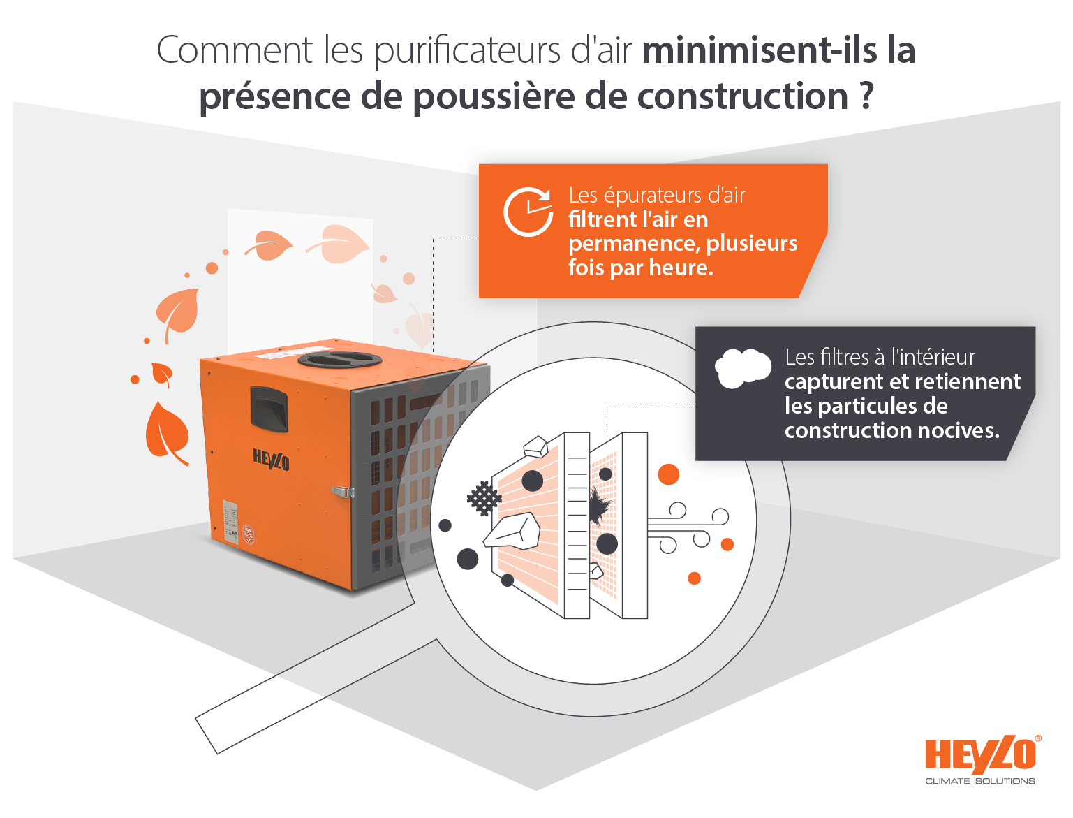 Pour limiter la propagation des particules de construction, des systèmes de contrôle des poussières sont conçus et installés spécifiquement pour empêcher la propagation des contaminants. Ces solutions captent et éliminent les poussières malsaines des zones où opèrent les travailleurs.