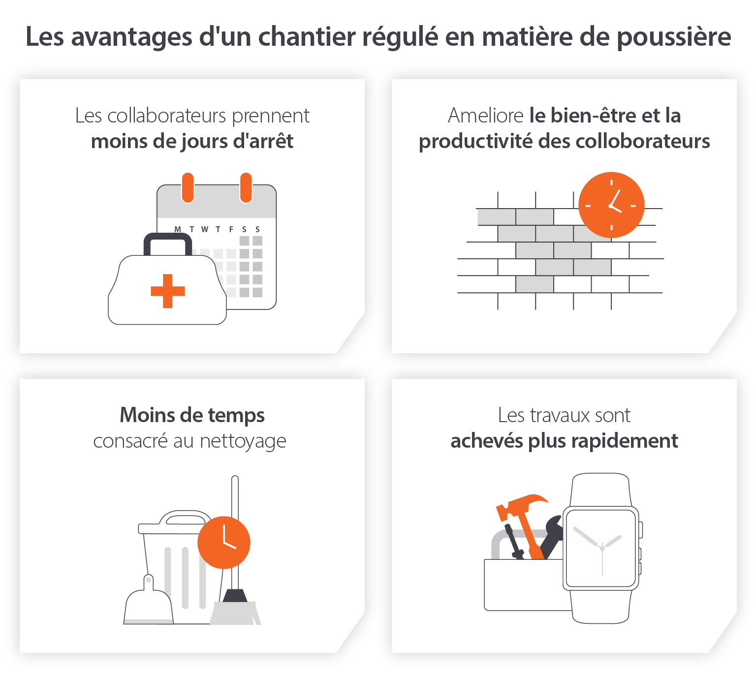 En effet, les problèmes de santé qui peuvent résulter d'une surexposition à la poussière de chantier peuvent distraire les gens, affecter l'endurance des employés et rendre les tâches plus longues et plus pénibles à exécute.