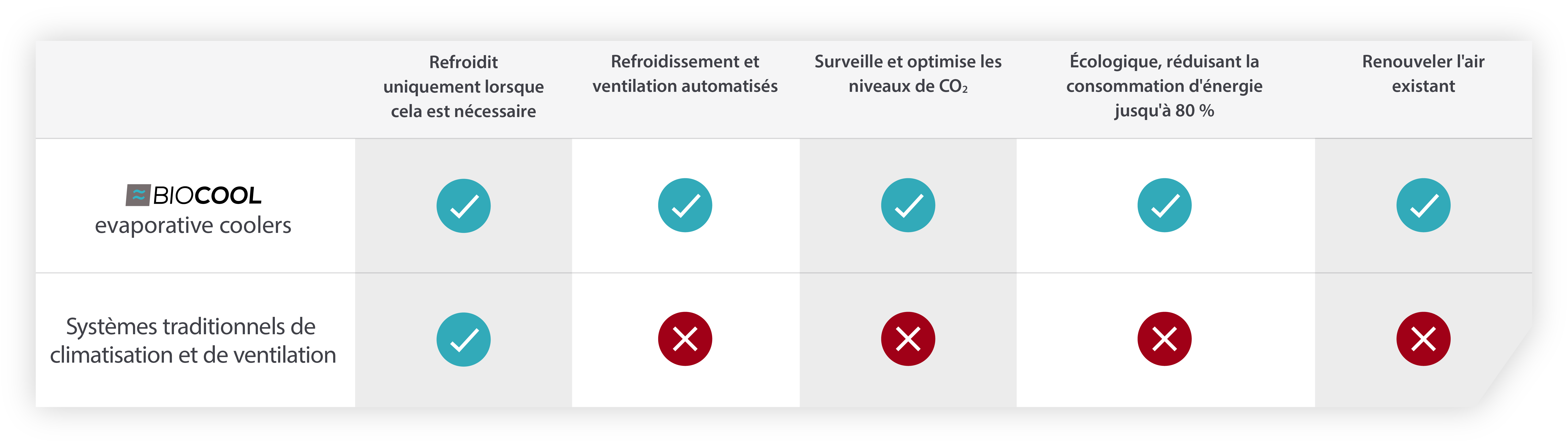 Les systèmes de climatisation conventionnels peuvent fonctionner comme un système de ventilation, mais avec une consommation d’énergie beaucoup plus élevée à la fois pour ventiler et refroidir. Ils fonctionnent également selon un principe de recirculation de l’air pour refroidir un bâtiment, sans contribuer à expulser l’air potentiellement plus chargé en CO2, et caractérisé par la présence de poussières, d'odeurs et de virus en suspension dans l’air.